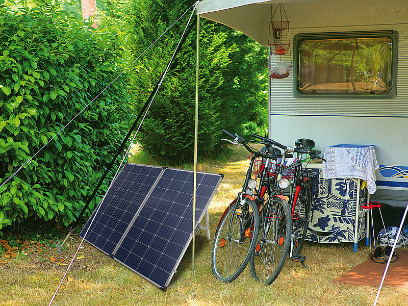 - Panneau solaire avec câble de connexion (5 m) avec borne polaire, pieds de support, housse de protection et mode d'emploi en français